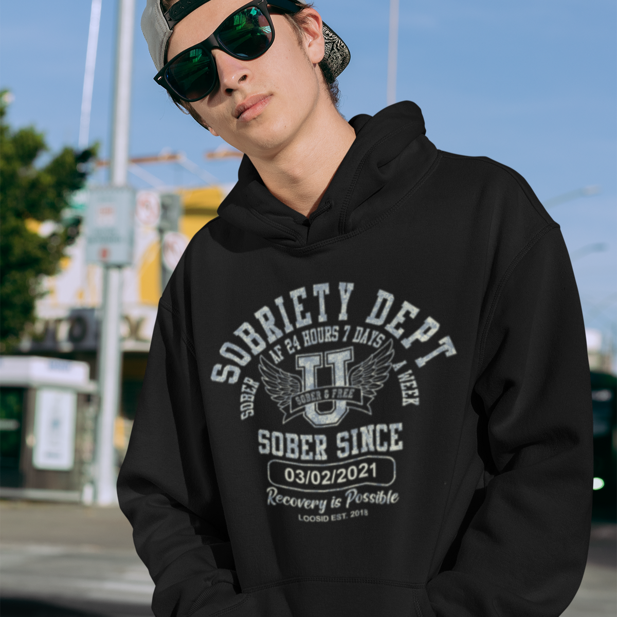 Sobriety Dept Unisex Hoodie – Sober AF 24/7 with Custom Sobriety Date Hoodie