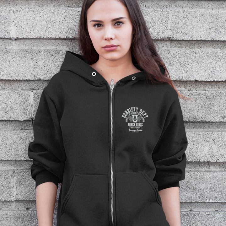 Sobriety Dept Unisex Zip Hoodie – Sober AF 24/7 with Custom Sobriety Date