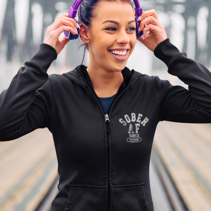 Sober AF Since Unisex Zip Hoodie with Custom Sobriety Date
