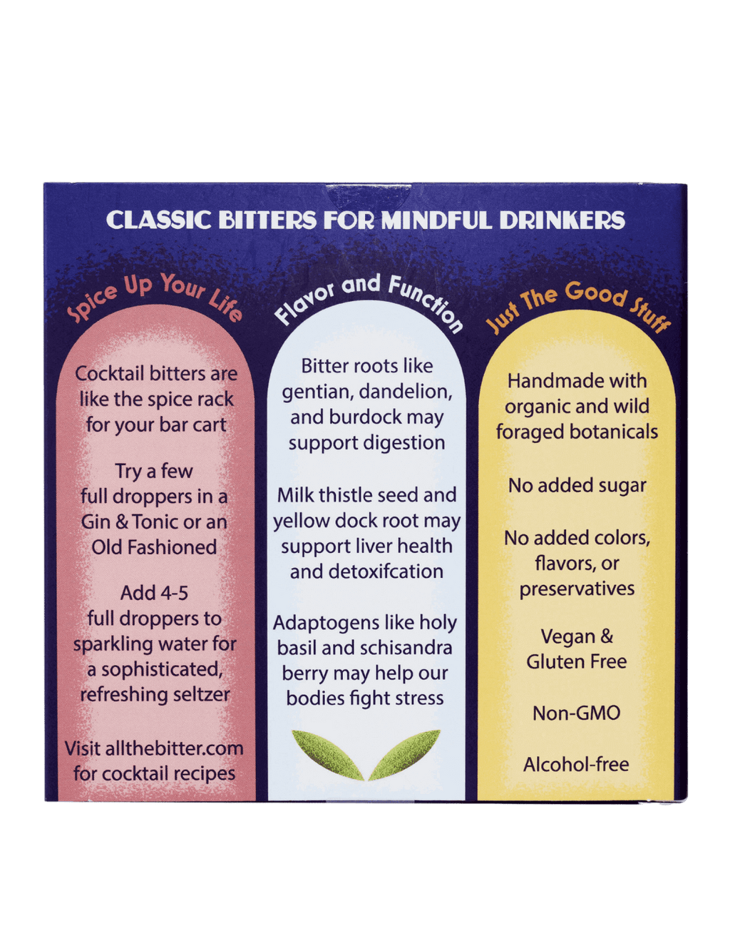 Each of our bitters are packed with organic, functional botanicals and may support digestion and liver health.