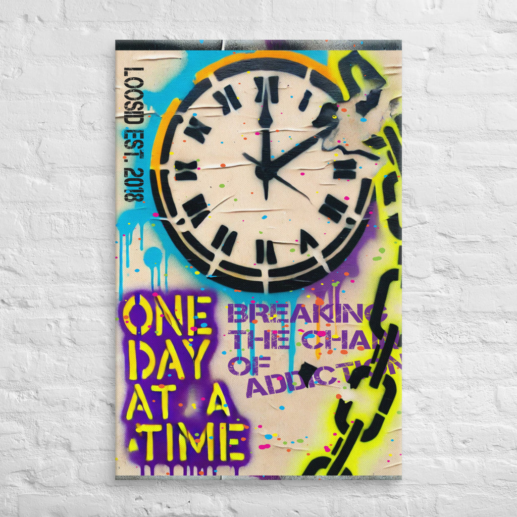 Transform your space with the gritty resilience and vibrant energy of our "One Day at a Time" canvas. This bold street-style artwork features a powerful clock symbolizing the passage of time, encircled by broken chains that signify freedom and strength. Graffiti-inspired elements and splashes of color bring this piece to life, capturing the spirit of taking each day as it comes.