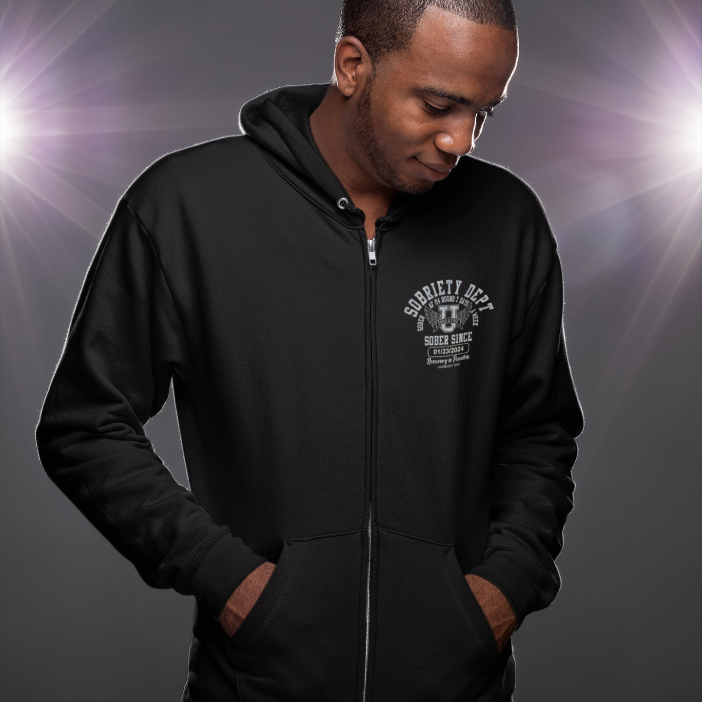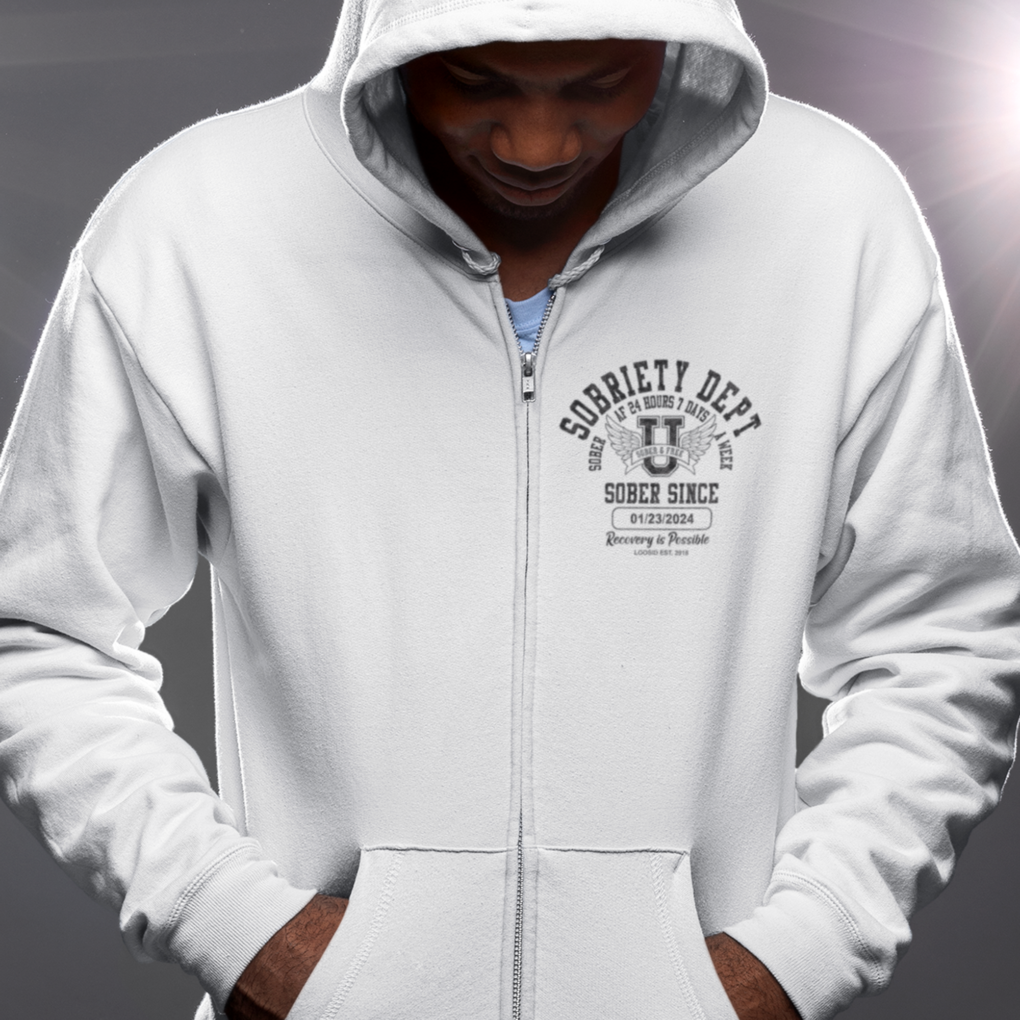 Recovery Hoodie | Sobriety Dept Sober AF 24/7 Zip Hoodie with Custom Date
