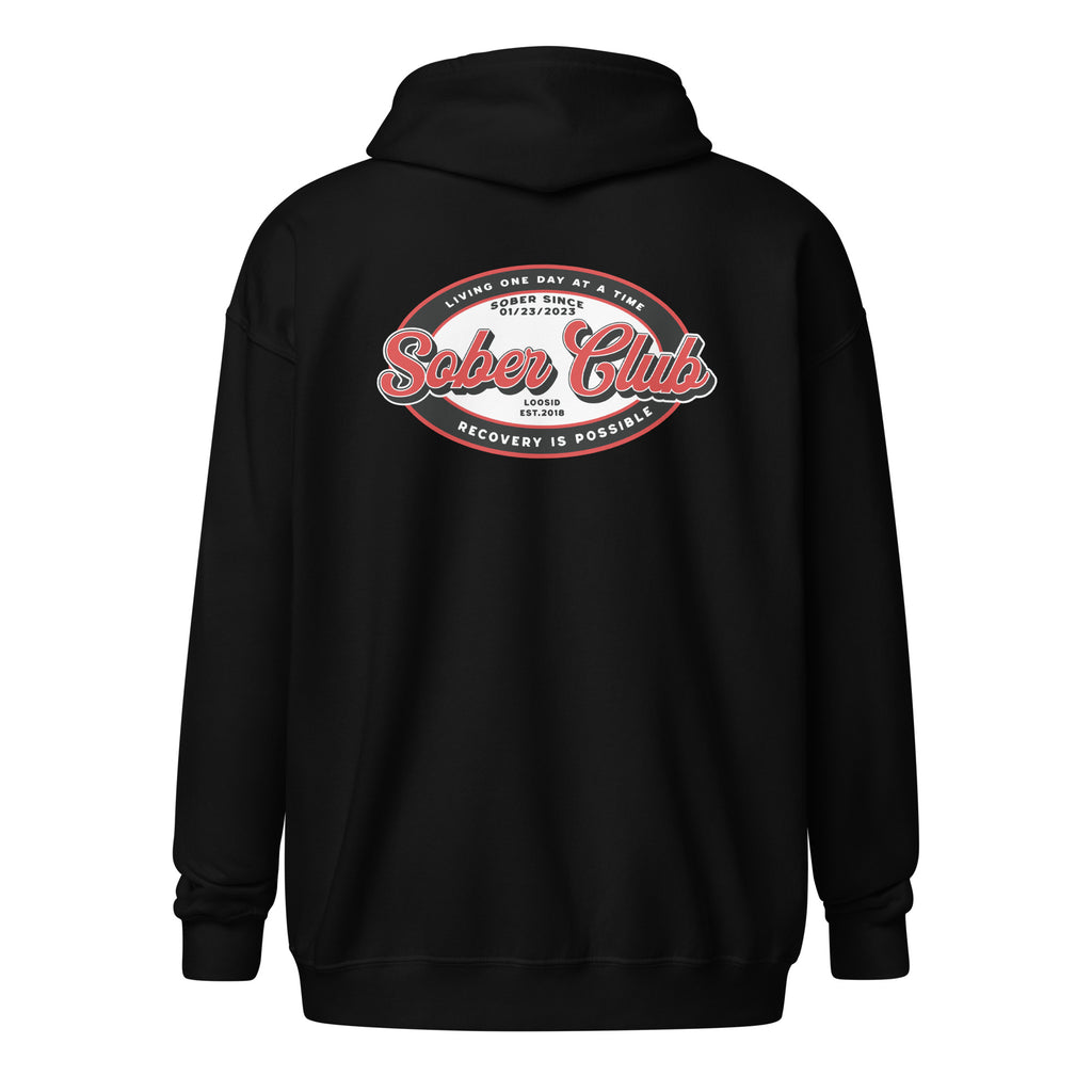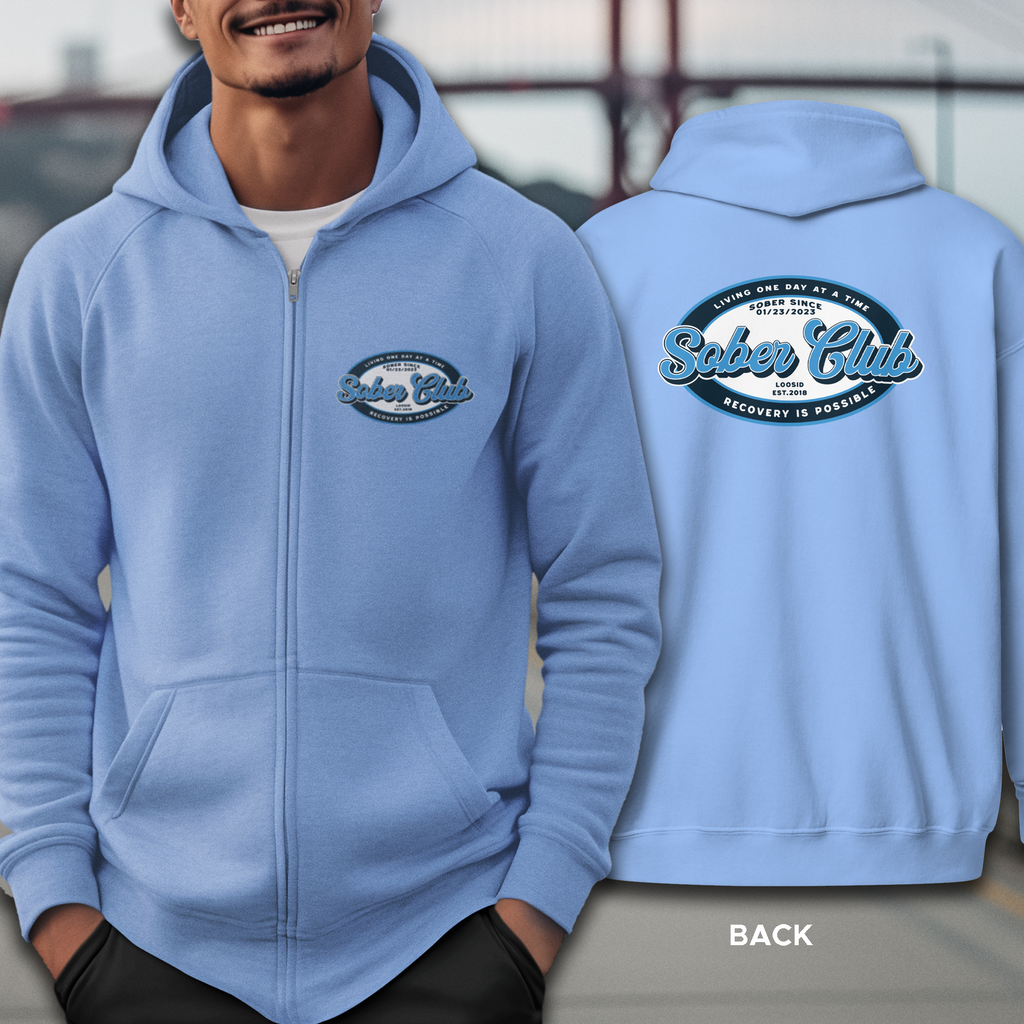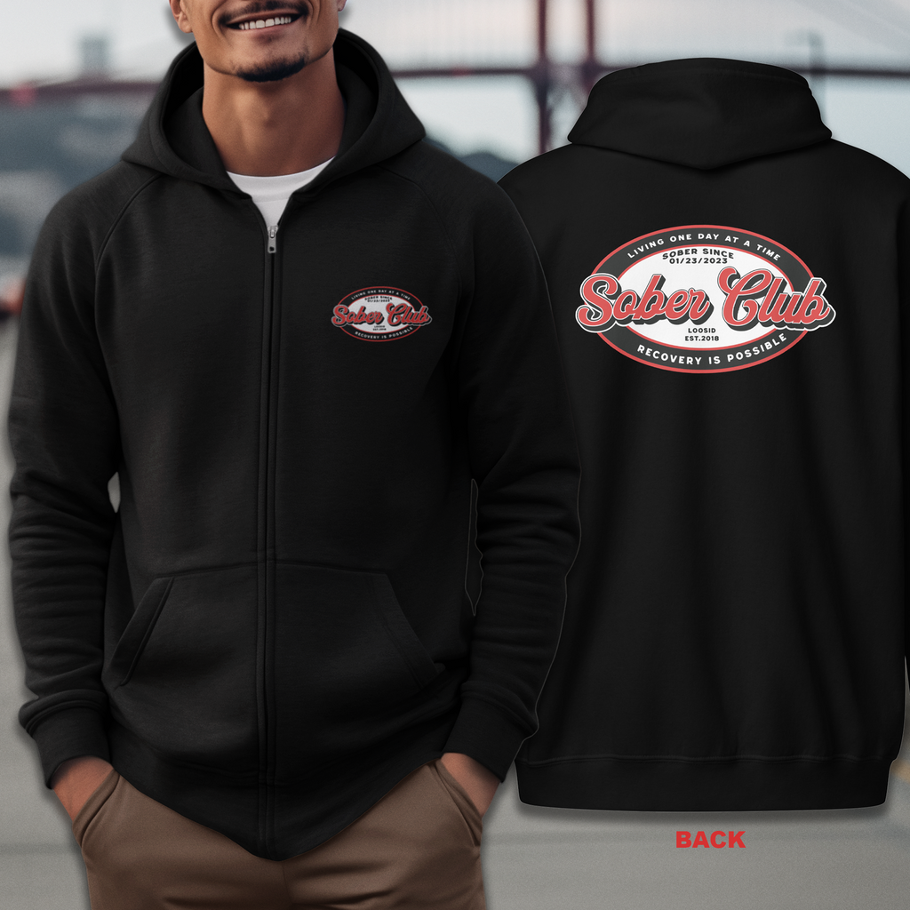 Sober Club Badge Unisex Zip Hoodie Front and Back Print Hoodie with Custom Sobriety Date (Front & Back)