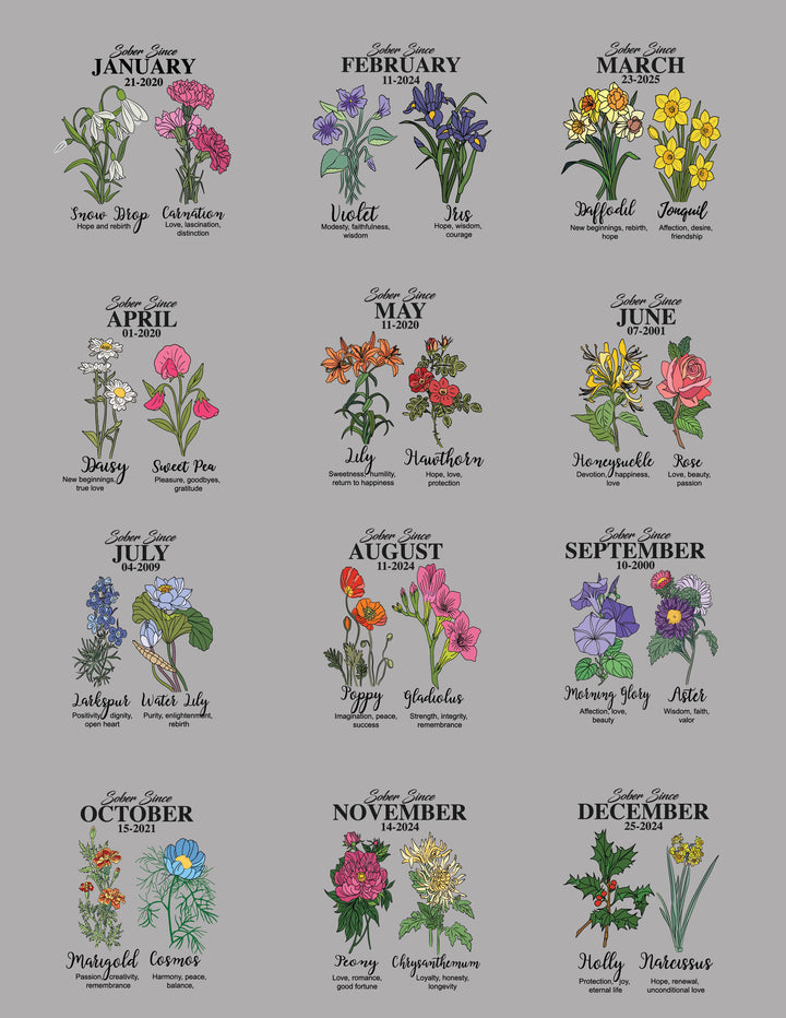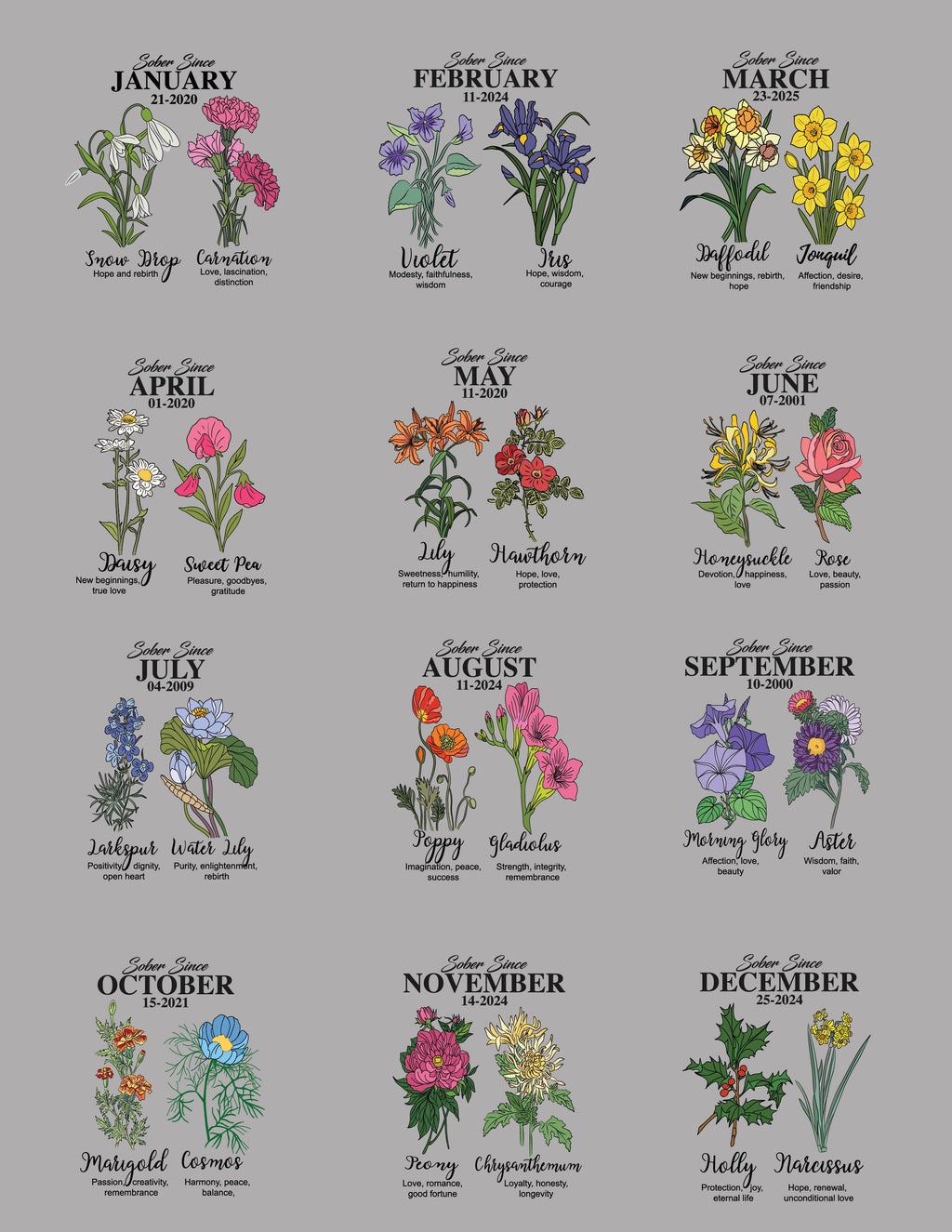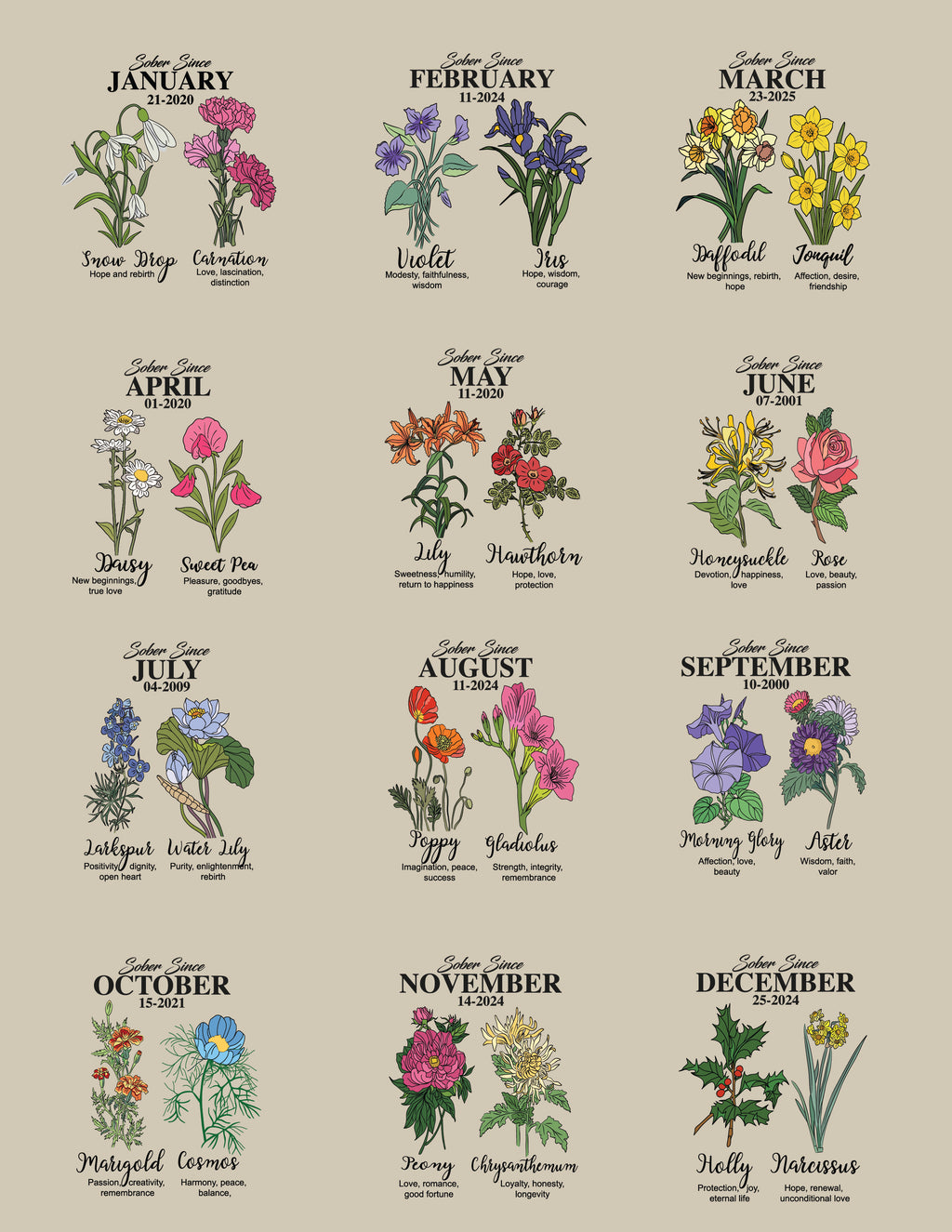 Our Sober Since Monthly Flower Tee is more than just a shirt—it's a personal milestone you can wear with pride. Each tee features the official flower of your sober month, symbolizing the strength, growth, and beauty of your journey. Just enter your sober date, and we’ll customize it just for you.