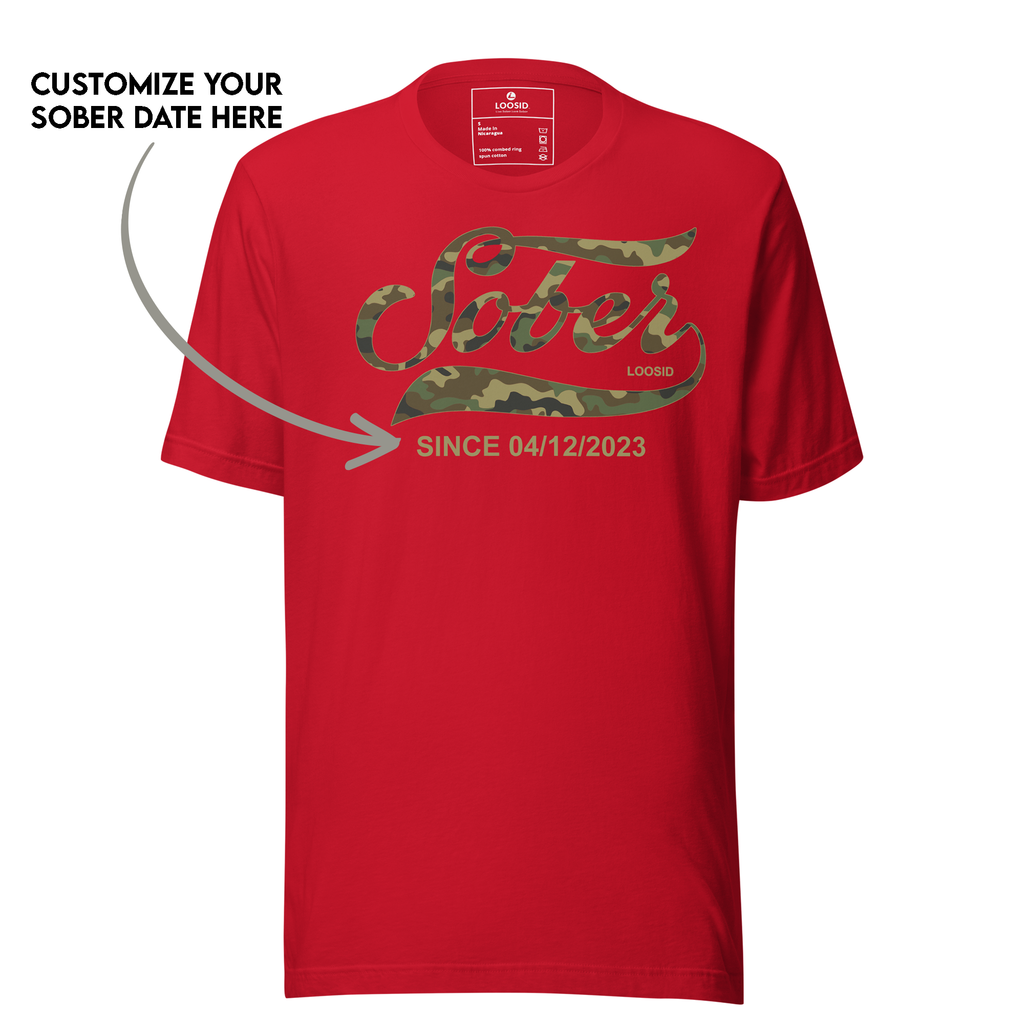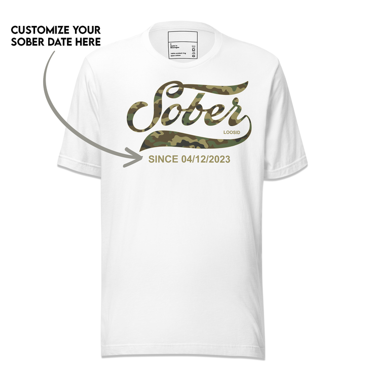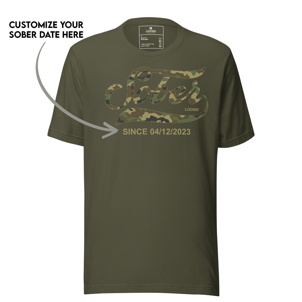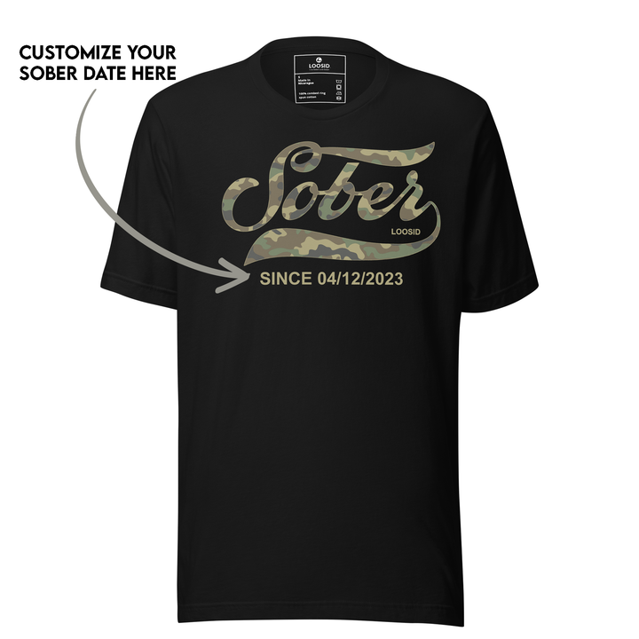 Showcase your sobriety milestone proudly with the Loosid Men's Sober Since Camo Sober T Shirt featuring your personalized sobriety date. This personalized Loosid t-shirt lets you celebrate your journey in a unique and meaningful way. Made with premium, ultra-soft fabric, this Sober T Shirt is designed for comfort and durability, whether you're lounging at home or out with friends.