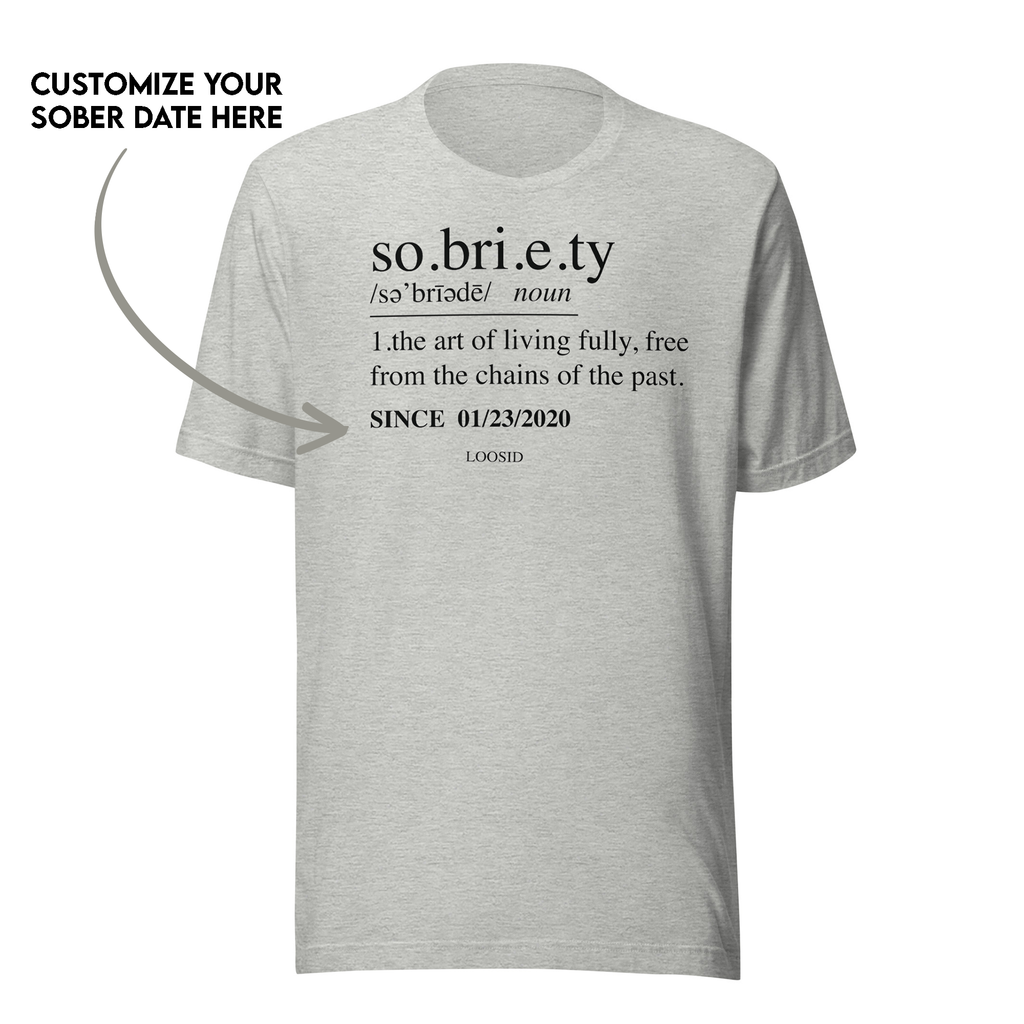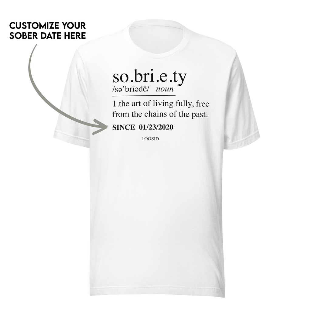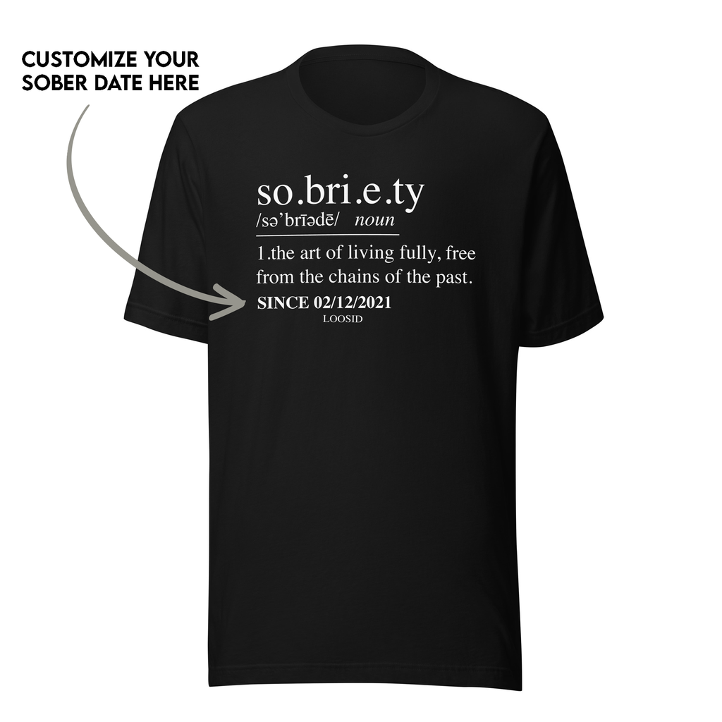 Showcase your sobriety milestone proudly with the Loosid Women's Sobriety Definition sober T shirt, personalized with your sobriety date. Made with premium, ultra-soft fabric, this t-shirt is designed for comfort and durability—whether you're lounging at home or out with friends. It's a meaningful way to celebrate your journey or support someone you care about with a bold and personal statement.