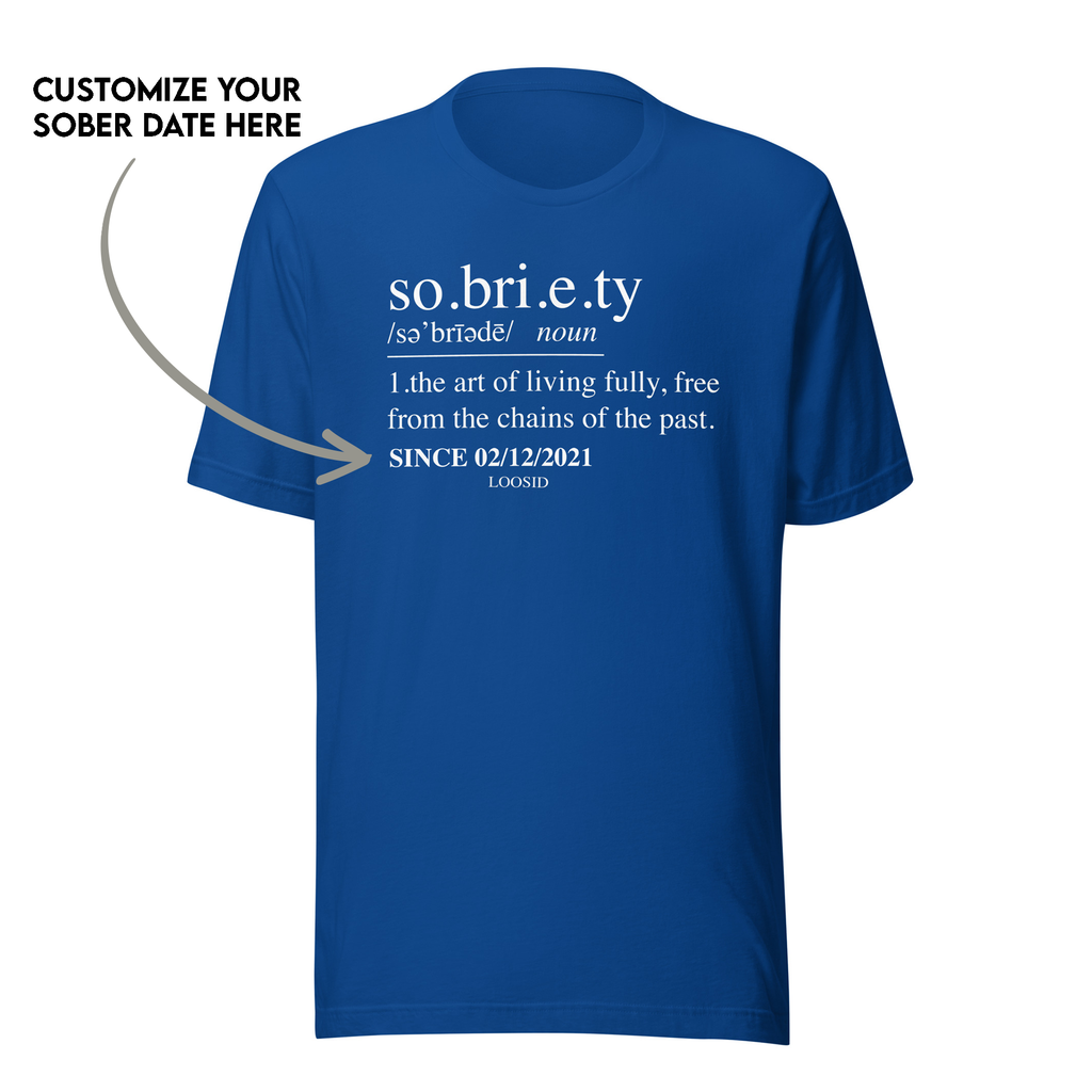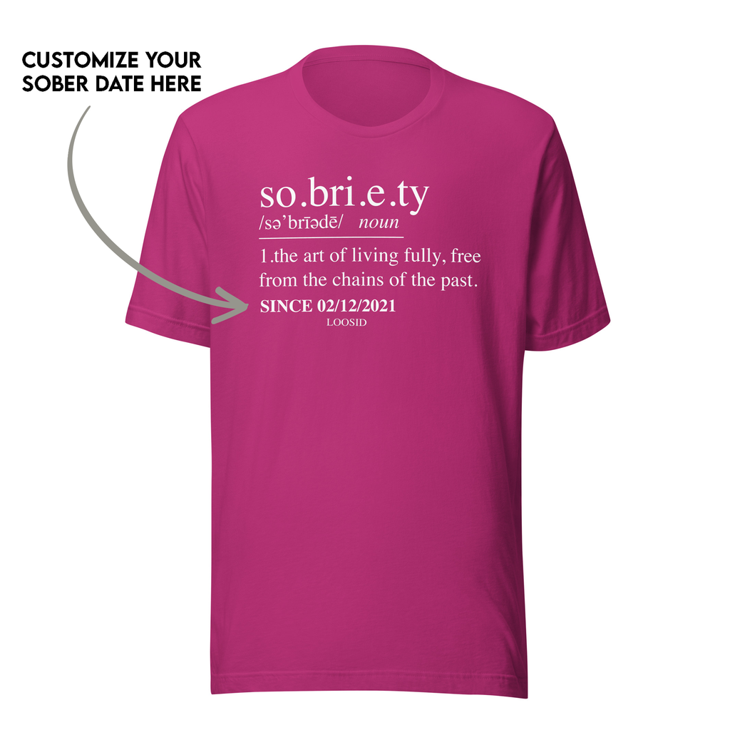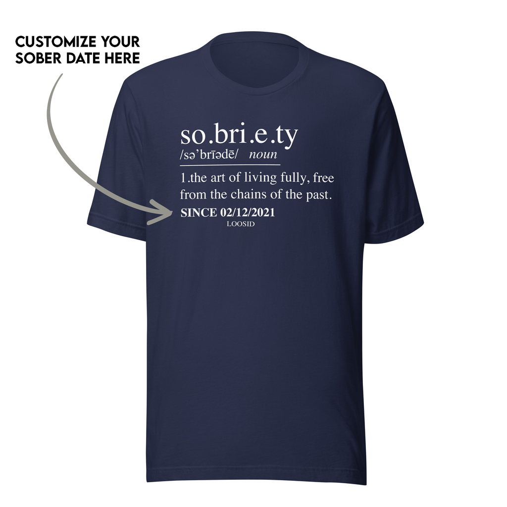 Showcase your sobriety milestone proudly with the Loosid Women's Sobriety Definition sober T shirt, personalized with your sobriety date. Made with premium, ultra-soft fabric, this t-shirt is designed for comfort and durability—whether you're lounging at home or out with friends. It's a meaningful way to celebrate your journey or support someone you care about with a bold and personal statement.