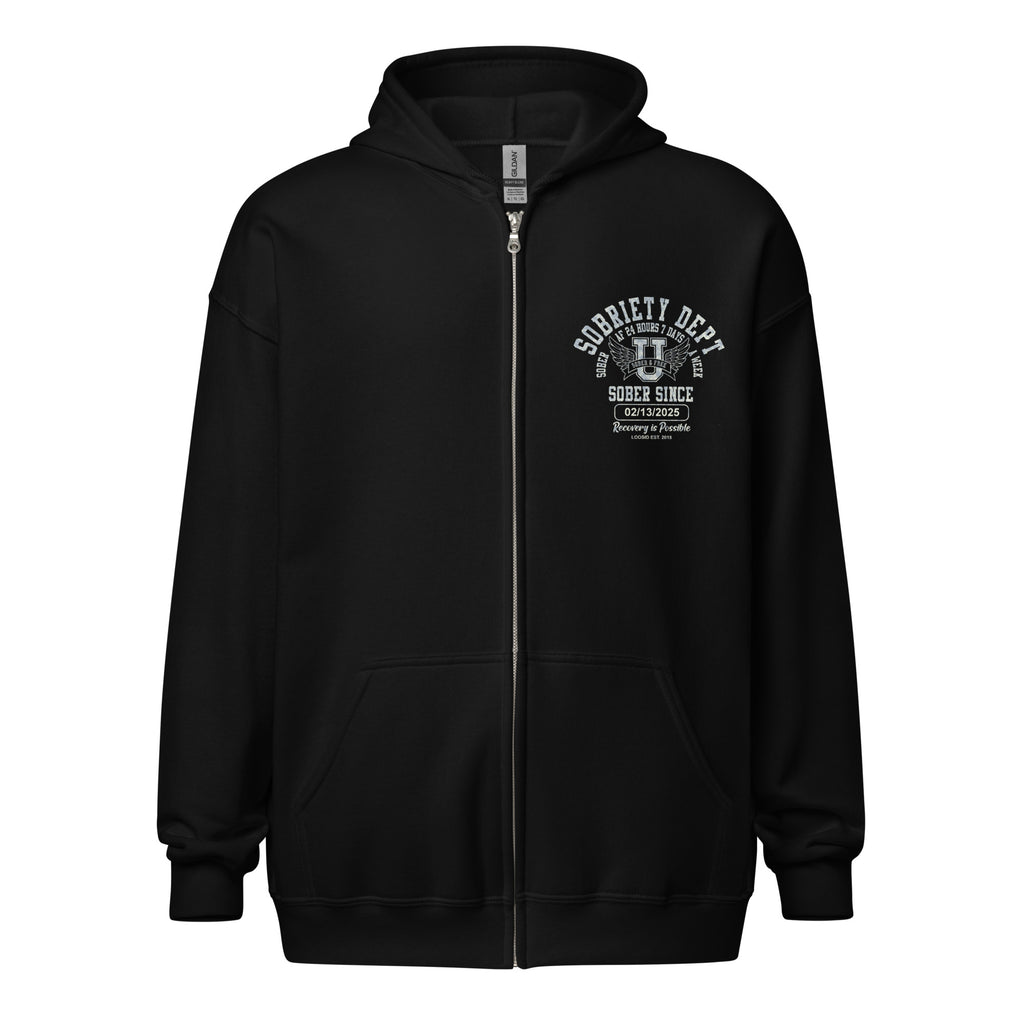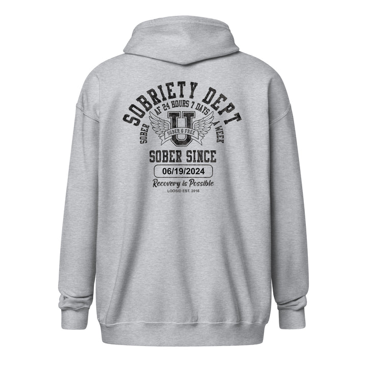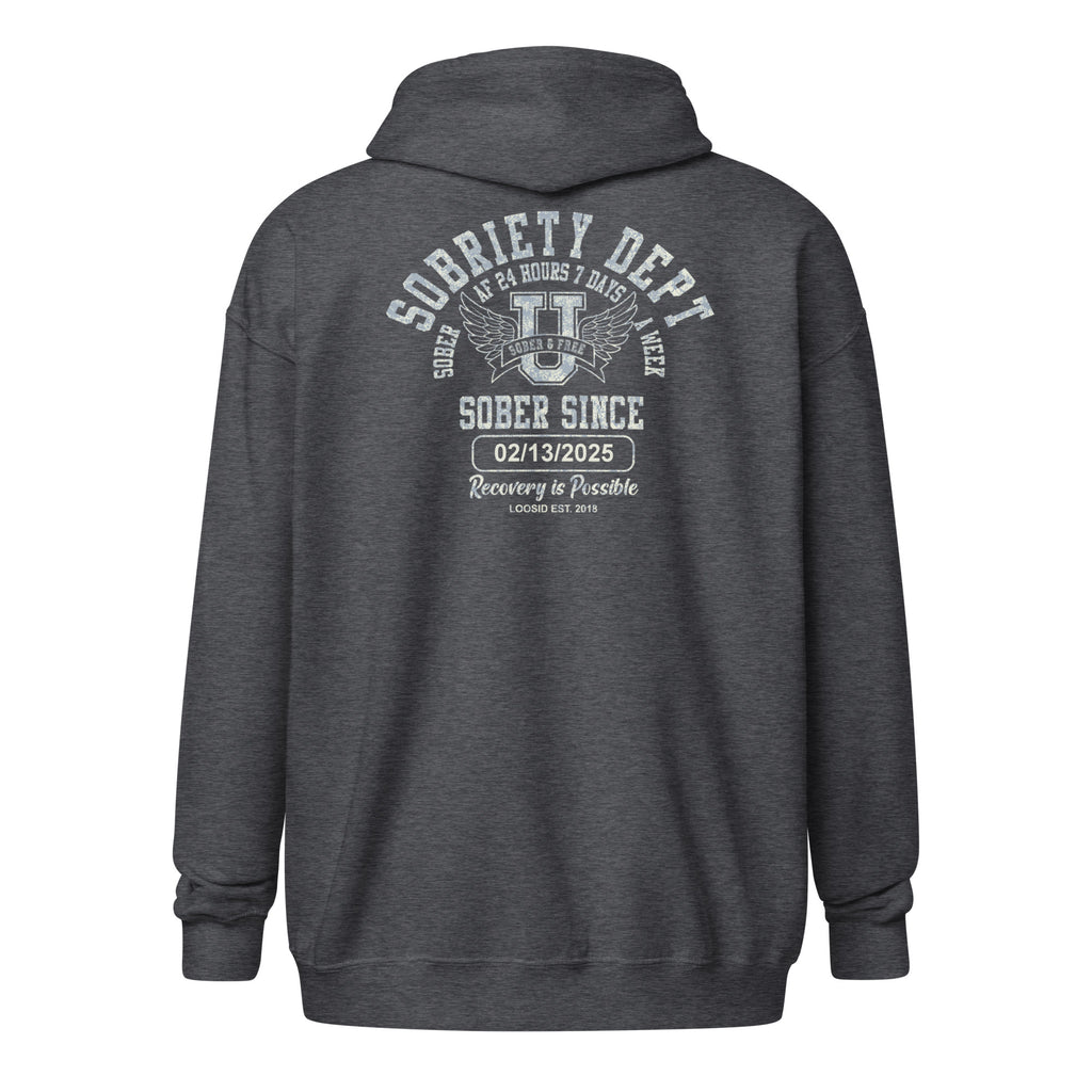 Sobriety Dept Unisex Zip Hoodie Front and Back Print Hoodie – Sober AF 24/7 with Custom Sobriety Date