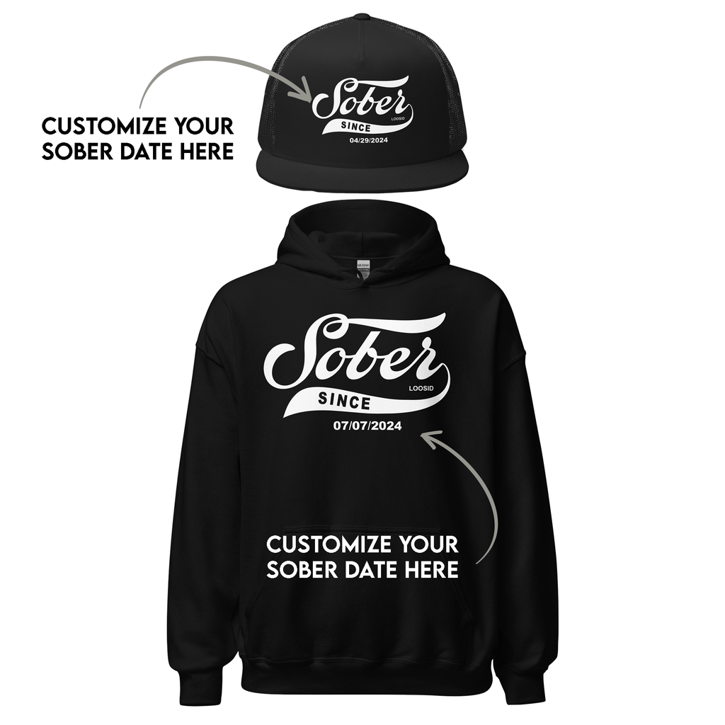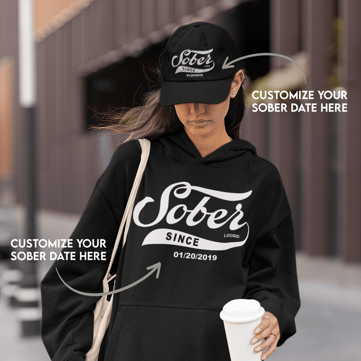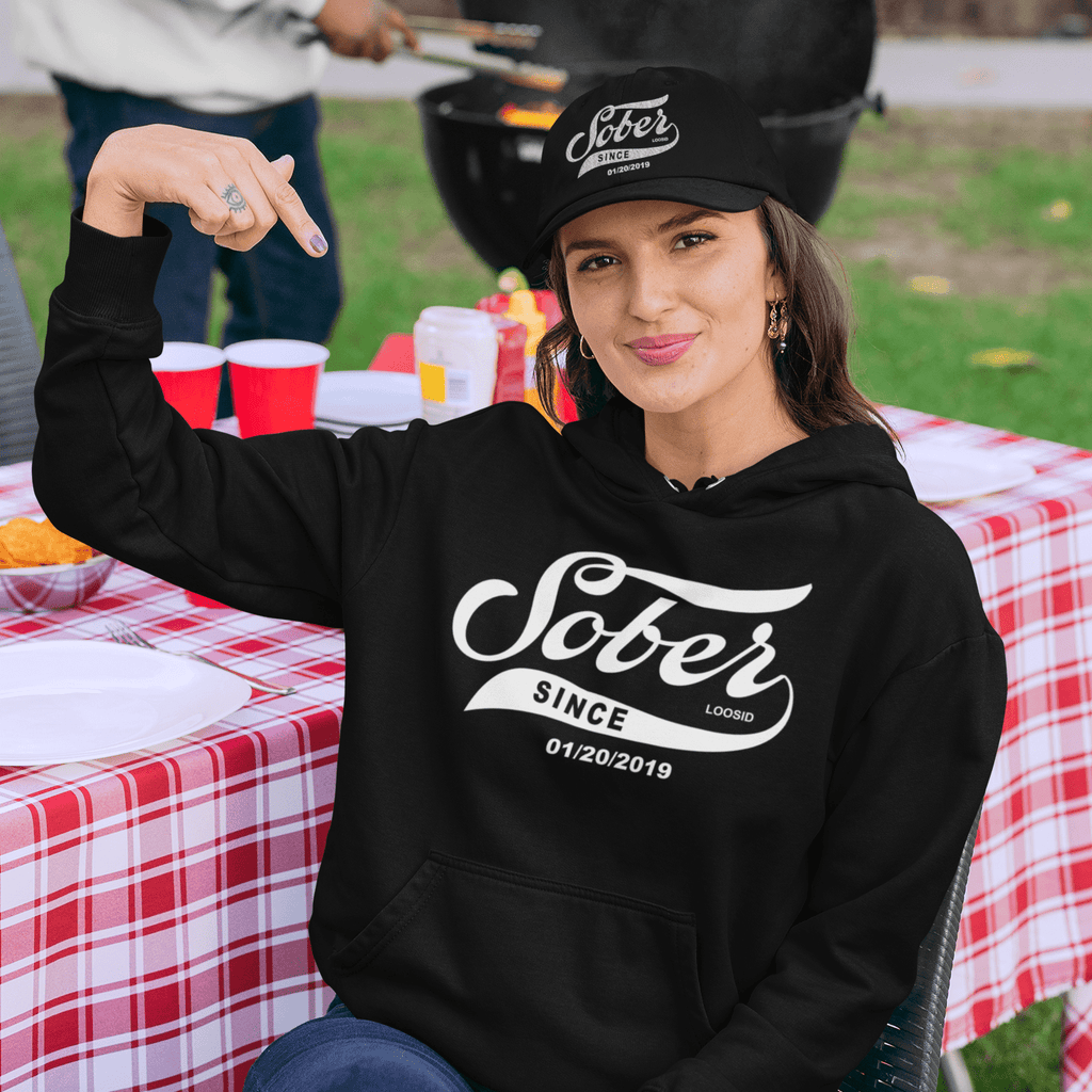 Showcase your sobriety milestone proudly with our top selling products bundled together in the Loosid Women's Old Sober Since Hoodie and Hat with your personalized sobriety date. This personalized Loosid hoodie and hat lets you showcase your sobriety milestone proudly and uniquely.
